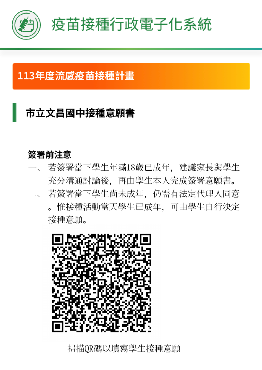 113年學生校園流感疫苗接種意願調查,今年以線上簽署方式辦理,