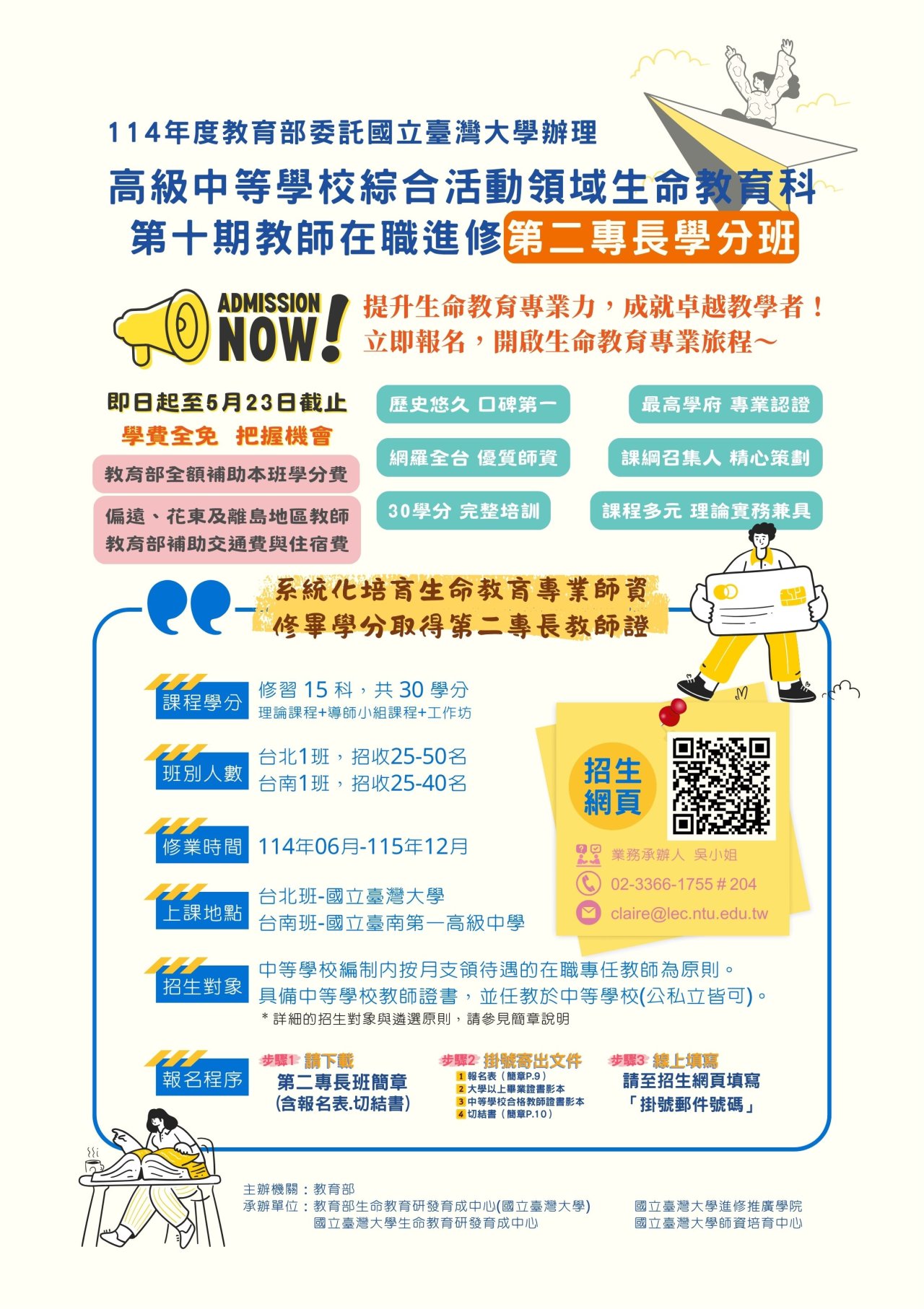 一、為落實十二年國民基本教育課綱精神,精進中小學教師生 命教育專業知能,教育部委請國立臺灣大學辦理「高級中 等學校綜合活動領域生命教育科教師在職進修第二專長學 分班」及「教師在職進修生命教育增能學分班」,學分費 皆由教育部全額補助。
