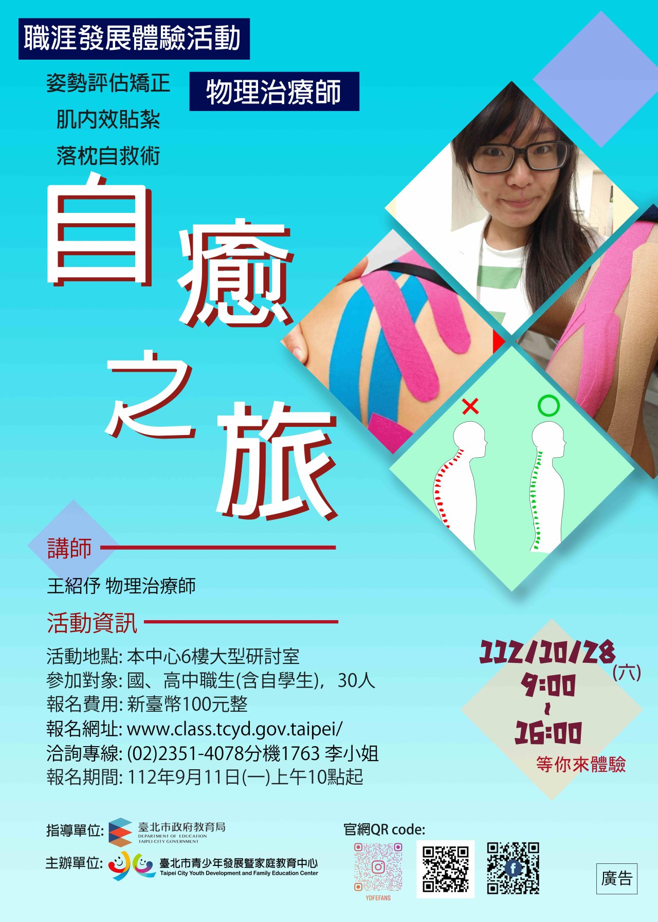 1、透過物理治療師的帶領,學習簡易姿勢評估、實際體驗物理治療師執行的貼紮及運動等活動,除了能理解物理治療師這個職業,也能對自己的身體健康有所幫助。