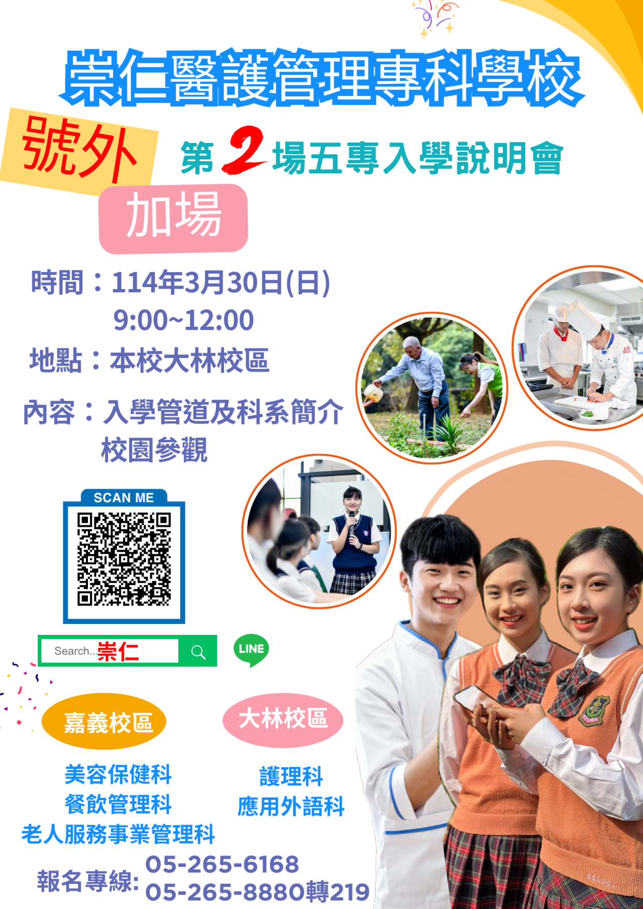 嘉義縣崇仁醫護管理專科學校辦理「114年第二場五專入學說明會」,訊息如下: