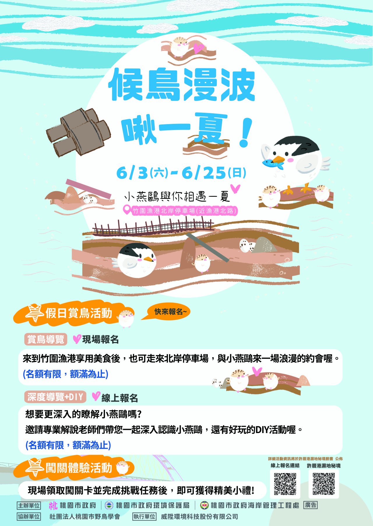 一、每年4月至8月期間是二級保育類小燕鷗遠從印尼、澳洲、紐西蘭等地飛抵臺灣繁殖棲地的季節,從5、6月開始尋覓伴侶,共築愛巢並孵蛋育雛,至7、8月返回南方,為使民眾對小燕鷗更深入認識,並以實際行動保護小燕鷗,達到海鳥保育生態教育意義,爰於112年6月3日至25日期間,每週例假日於竹圍漁港北岸停車場,舉辦「2023候鳥漫波 啾一夏!」活動,並提供小燕鷗導覽解說、DIY體驗、闖關遊戲等體驗,詳細活動資訊可參閱活動Facebook粉絲專頁「許厝港濕地秘境」(網址:https ://www.facebook.com/xucuogang)。