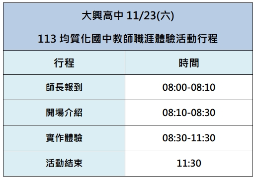 大興高中辦理113學年度第1學期均質化實施方案「113-5大興航空夢想起飛─國中教師職群體驗課程」,訊息如下: