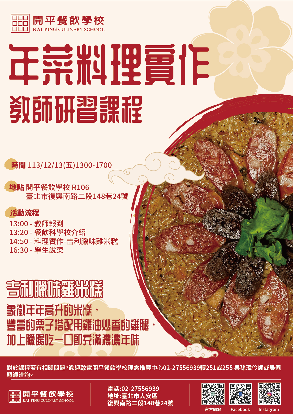 臺北市私立開平餐飲職業學校辦理「開平餐飲學校113學年度國中教師技職教育_創意年菜教師研習」,訊息如下: