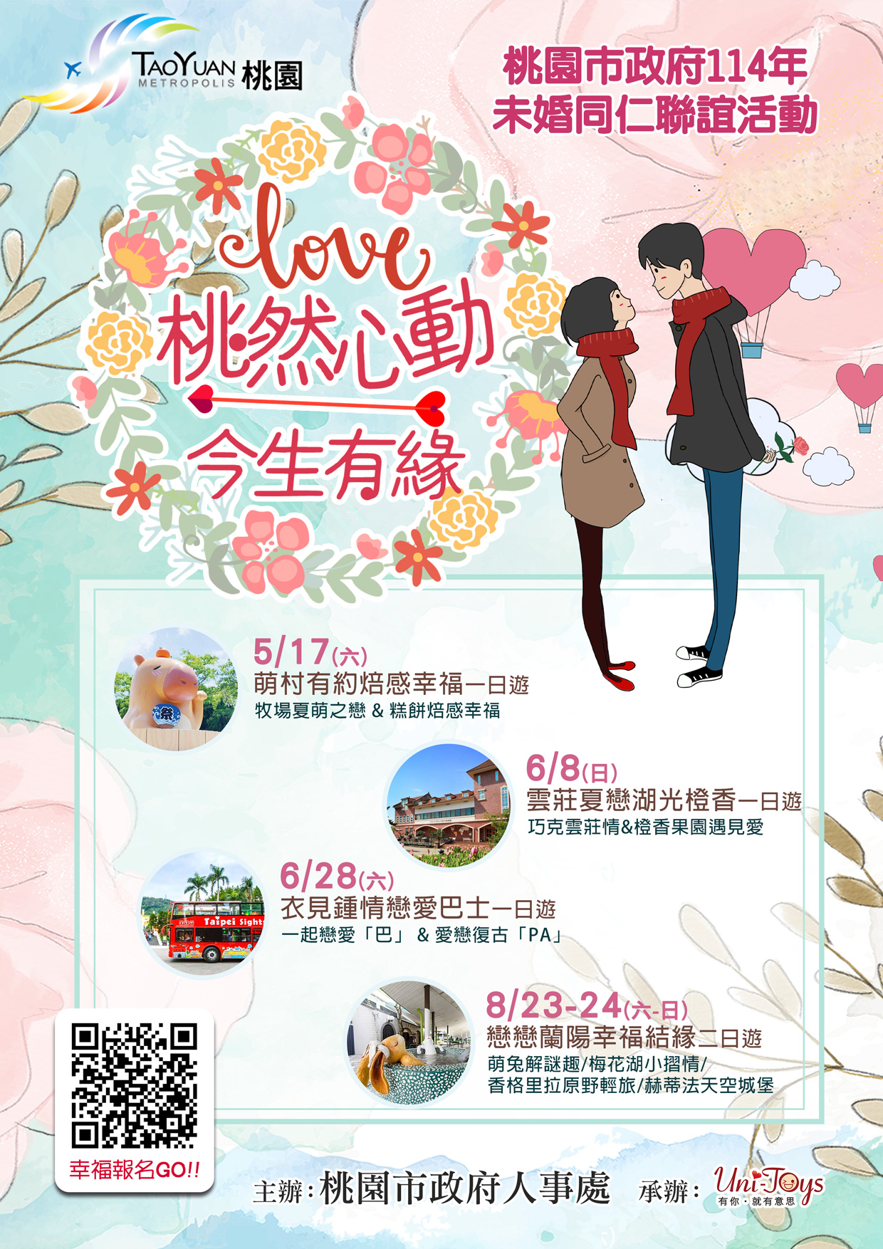 4、 第四梯次:114年8月23日及24日(星期六及日)「戀戀蘭陽幸福結緣二日遊」,假礁溪幾米兔子廣場、梅花湖、香格里拉休閒農場及赫蒂法莊園等地辦理,報名費用4,900元。