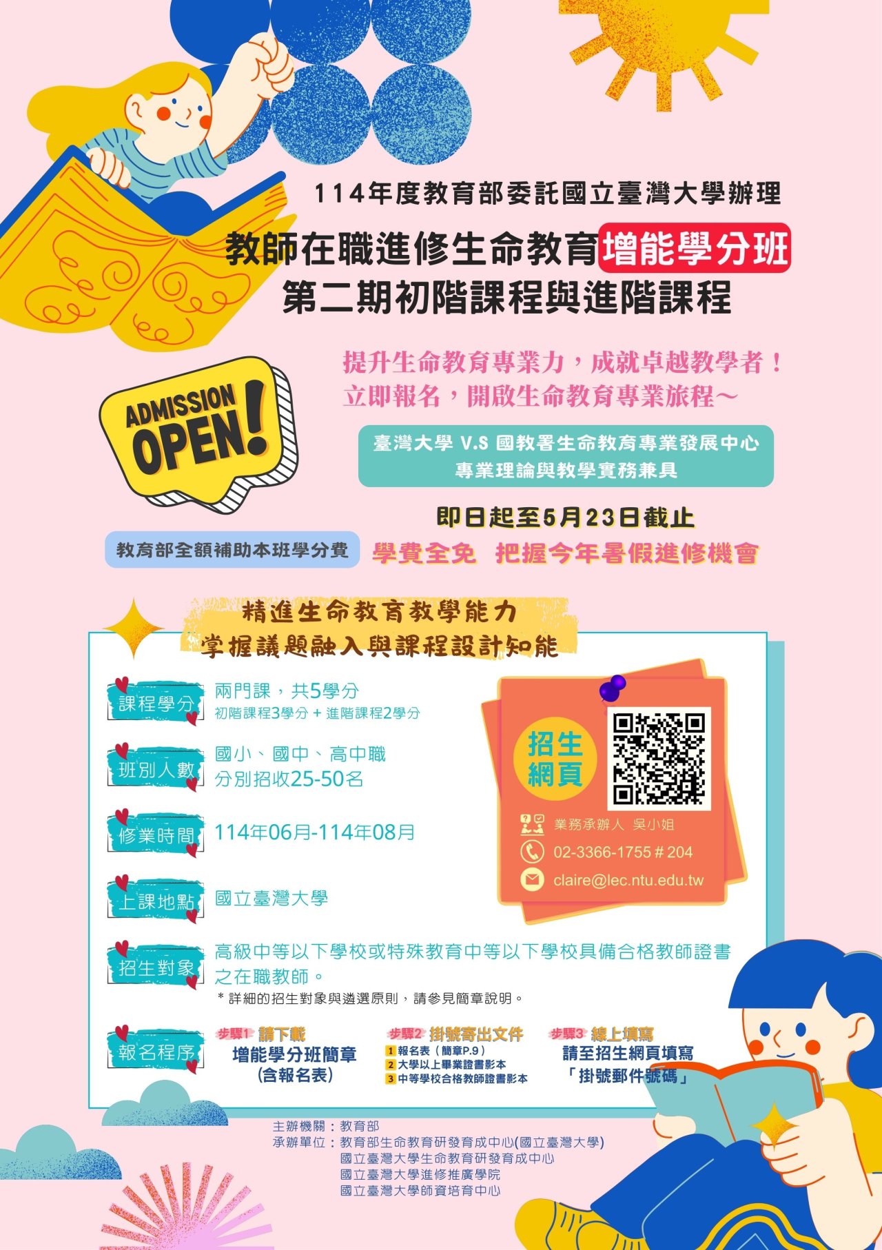 一、為落實十二年國民基本教育課綱精神,精進中小學教師生 命教育專業知能,教育部委請國立臺灣大學辦理「高級中 等學校綜合活動領域生命教育科教師在職進修第二專長學 分班」及「教師在職進修生命教育增能學分班」,學分費 皆由教育部全額補助。