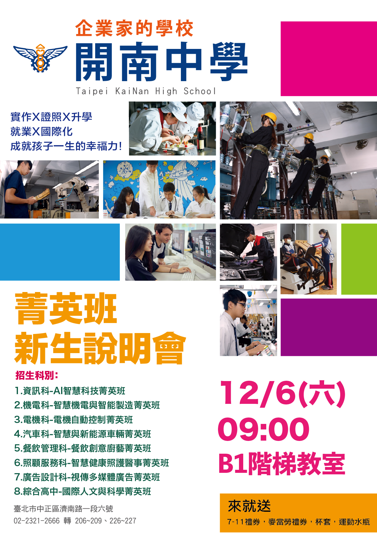 台北市開南高中辦理「114學年度第一學期菁英班新生家長說明會」,訊息如下: