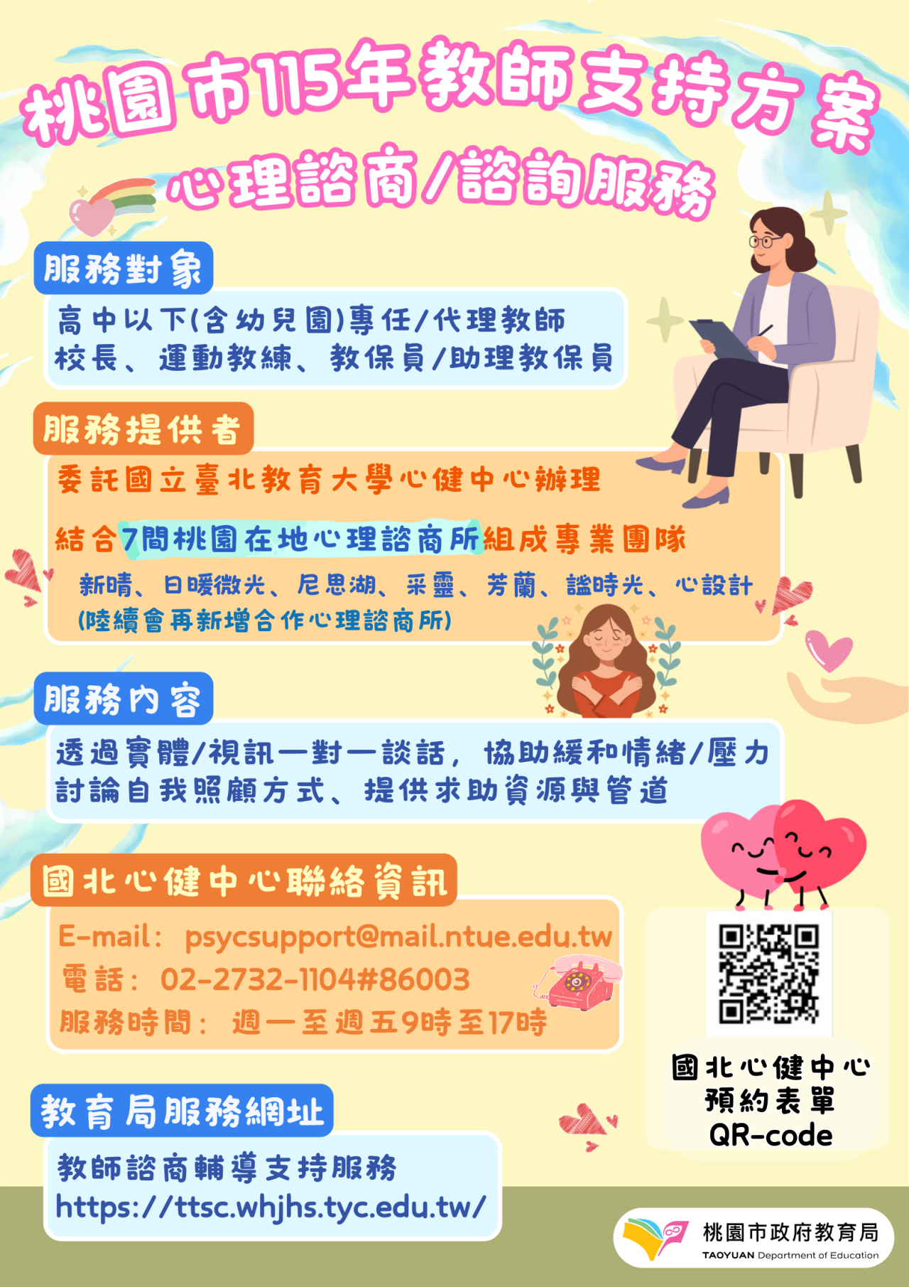 二、前揭合作諮商所資訊及預約表單連結皆已更新於「桃園市 政府教育局教師諮商輔導支持服務」專頁(https://ttsc. whjhs.tyc.edu.tw/),若有合作諮商所相關疑問,請逕洽 國立臺北教育大學教師支持方案專用信箱 psycsupport@mail.ntue.edu.tw 詢問,或致電劉心理師 (02) 2732-1104#86003。